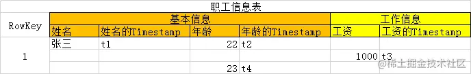 现在再来看这条数据,姓名只有一个版本 t1 -> 张三,年龄有两个版本 t2 -> 22、t4 -> 23 ,工资只有一个版本 t3 -> 1000, 当查询数据时,默认展示列最新版本的数据,也就是说,我们查询 RowKey =1 时,结果为 张三 23 1000