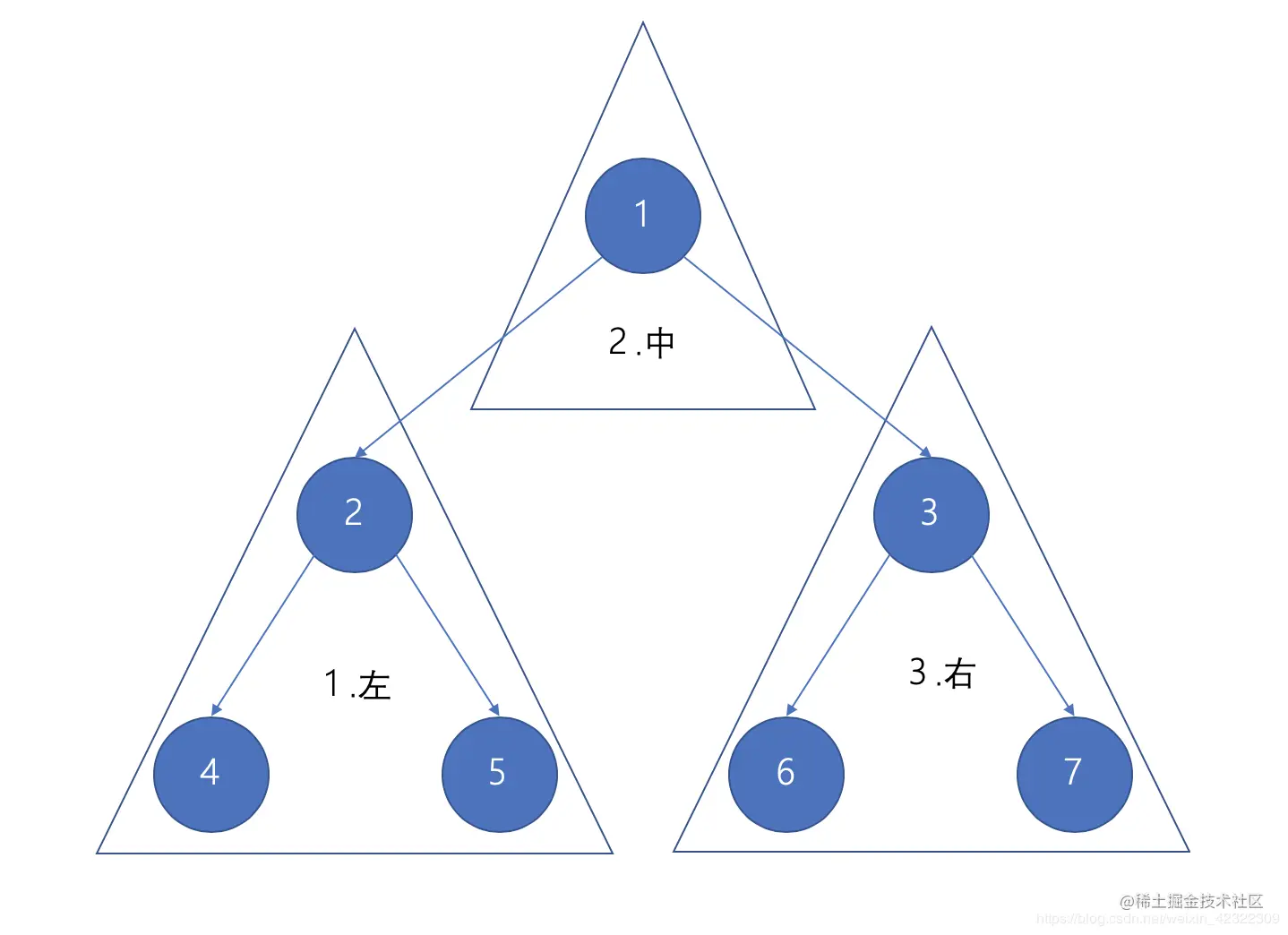 根节点 -> 左孩子 -> 右孩子的方式遍历,即「先序遍历」,每次先遍历根节点,遍历结果为1 2 4 5 3 6 7;