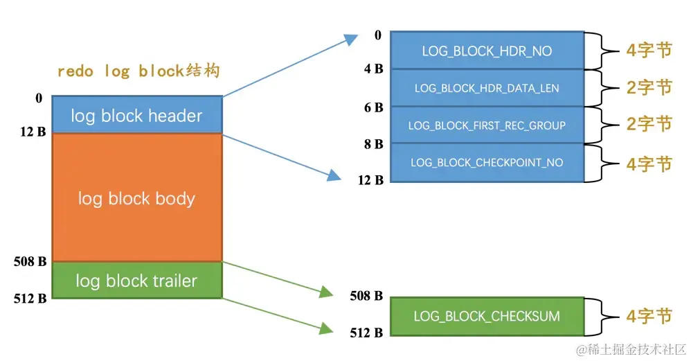 log buffer本质上是一片连续的内存空间,被划分成了若干个512字节大小的block。将log buffer中的redo日志刷新到磁盘的本质就是把block的镜像写入日志文件中,所以redo日志文件其实也是由若干个512字节大小的block组成。