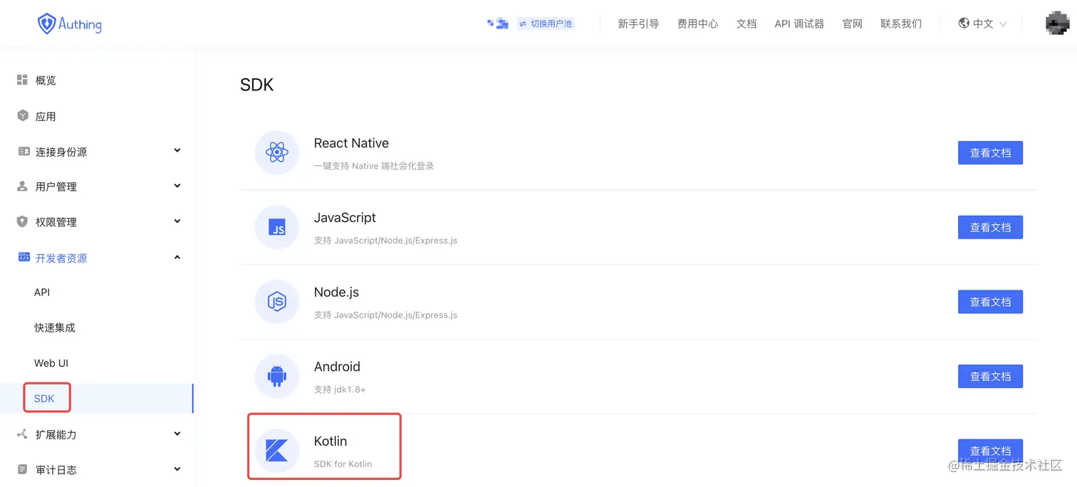 点击左侧的SDK菜单项,在右侧会看到有 Kotlin 的 SDK ,点击查看文档即可查看详细的 API。