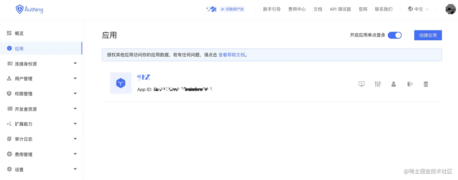 首先要在 Authing 注册一个账号,然后进入控制台,点击左侧的应用菜单项,在右侧会看到一个默认创建好的应用。