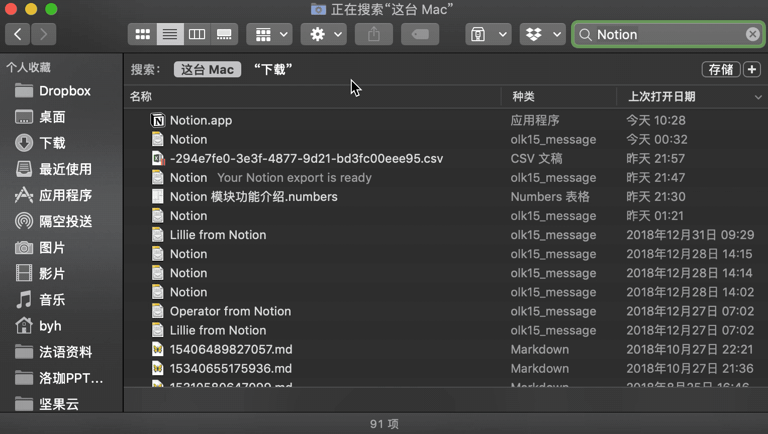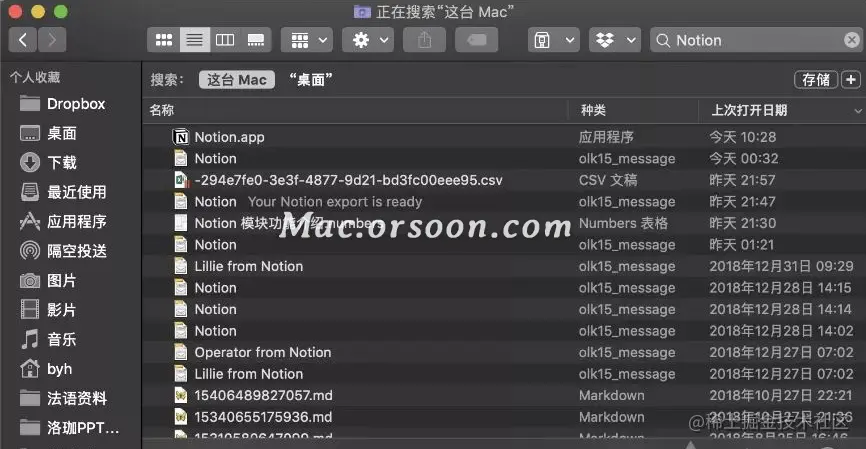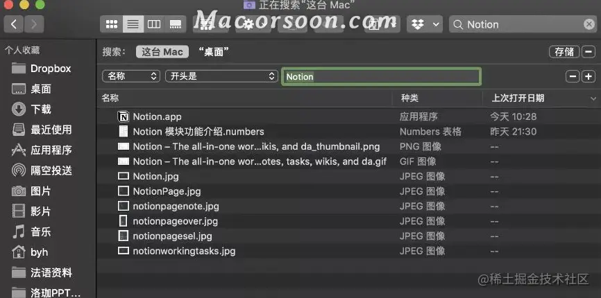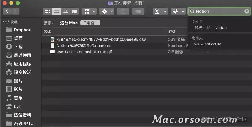 看到检索结果,或许你会疑惑,第一个和第三个不含有「Notion」这个关键词啊,这是因为在默认状态下,系统会自动检索文件内容、文件信息是否含有关键词。第一份表格里面就包含有「Notion」的内容,而第三个 GIF 图的来源也包含了此关键词。