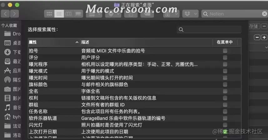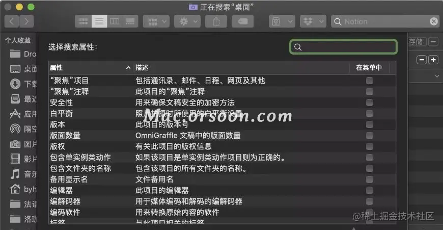 当我们点击检索条件中的其他的时候,Mac 会提供给我们多达 213 种精确检索条件,具体数量根据你的 app 数量决定,每个 app 提供的精确检索条件不一。