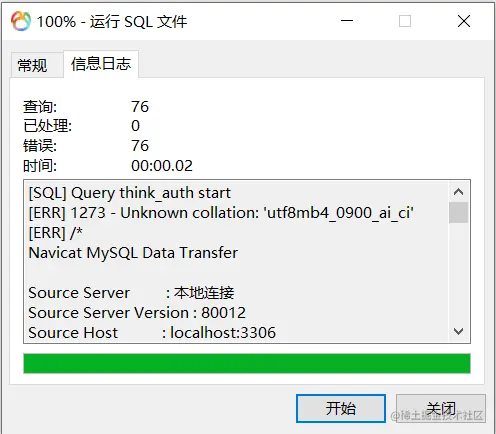 MySql数据库导入sql错误 ( Unknown collation: 'utf8mb4_0900_ai_ci' ) yuu_t 2020-12-30 758 阅读1分钟 使用NaviCat导入.sql文件报错/命令行导入报 Unknown collation: 'utf8mb4_0900_ai_ci' 错误原因:高版本数据库(8.0)转存sql文件 并导入低版本数据库(5.7) 解决办法: 方案一:升级mysql至高版本 方案二:将需要导入的sql文件,把其中的 utf8mb4_0900_ai_ci 全部替换为 utf8_general_ci utf8mb4 替换为 utf8 重新执行sql文件