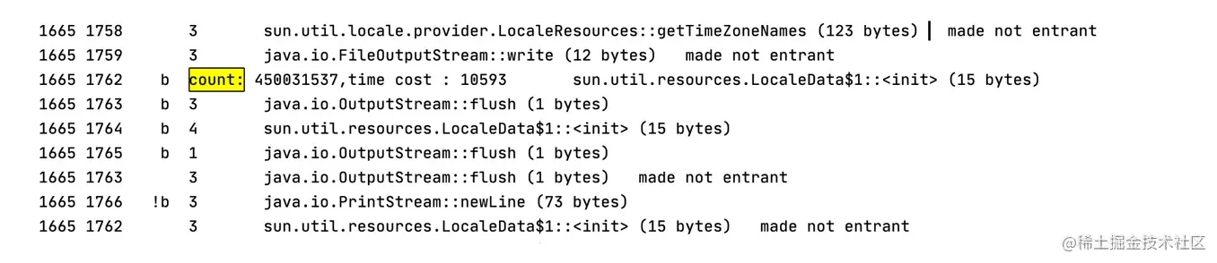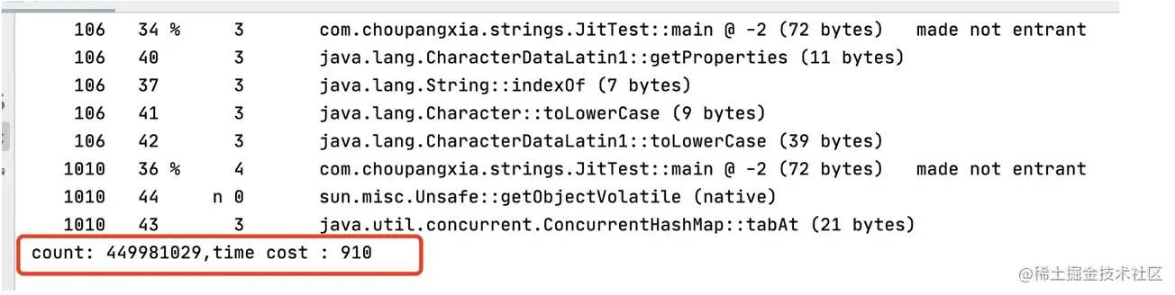 最后,采用混合模式再测试一次,修改虚拟机参数为 “-XX:+PrintCompilation”,执行 main 方法: