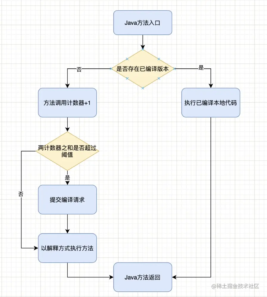 在部分的商用虚拟机中,比如 HotSpot 中,Java 程序先通过解释器(Interceptor)进行解释执行。这也是为什么称 Java 是基于解释执行的原因。但当虚拟机发现某块代码或方法运行的特别频繁,便会将其标记为 “热点代码”(Hot Spot Code)。