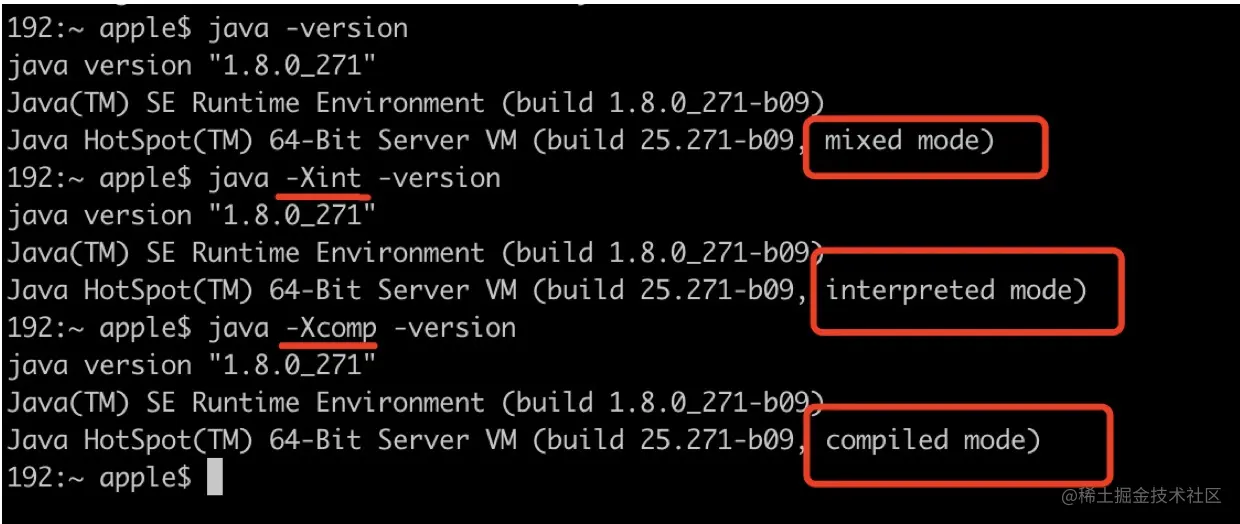 经过上述粗略的测试,会发现在上述示例中耗时由小到大顺序为:混合模式 < 纯编译模式 < 纯解释模式。当然,如果需要更精准和更准确的测试,还需要严格的基准测试条件。