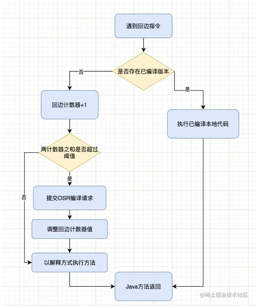 与方法计数器不同,回边计数器没有计数热度衰减的过程,因此统计的就是该方法循环执行的绝对次数。当计数器溢出时,它还会把方法计数器的值也调整到溢出状态,这样下次再进入该方法的时候就会执行标准编译过程。