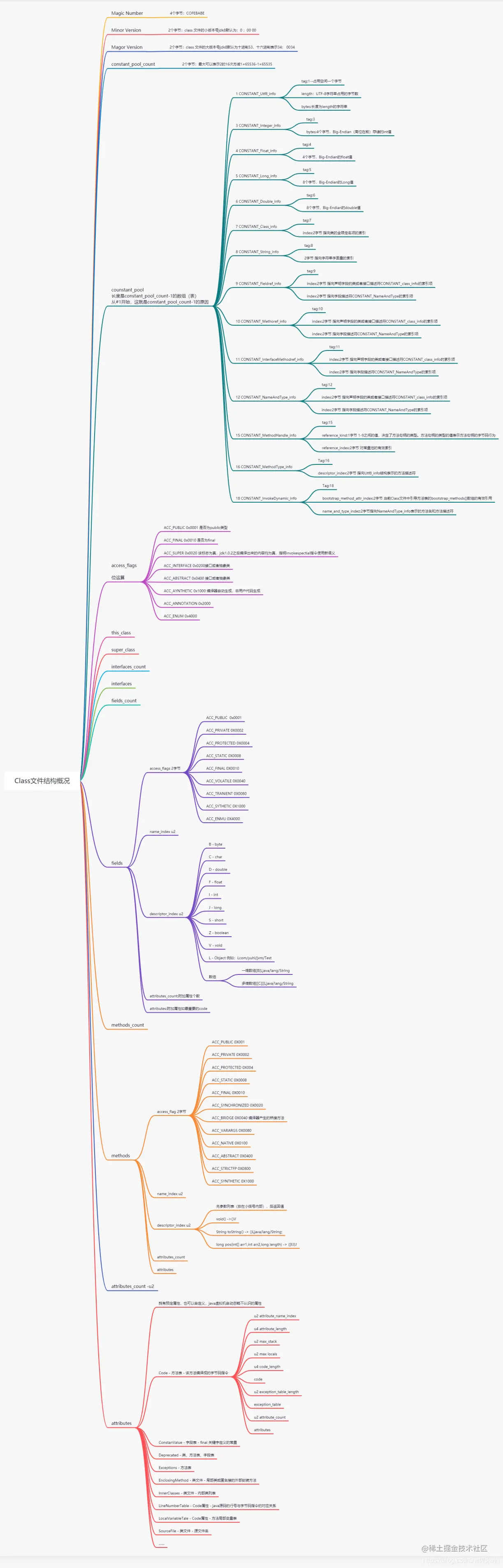 这个脑图是对 class 中含有文件的整体概况,一定要先过一遍,要有感性认识,然后在看二进制或者 16 进制的 class 文件源文件的时候绘图对照这个图,让这个图作为一个字典使用。