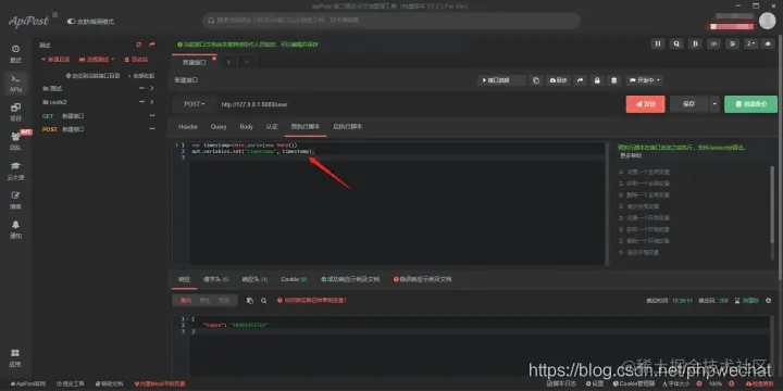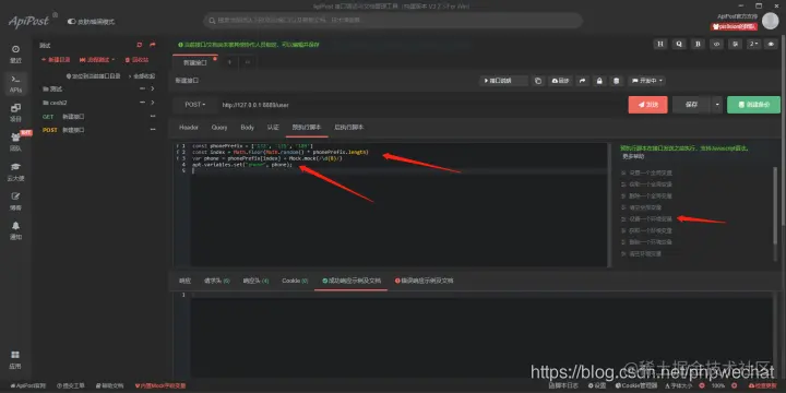 1)生产一个随机手机号,熟悉mock.js的可以自己编写一下,不会的可以直接百度,然后粘贴到与执行脚本中,在设置一个环境变量,变量值为数据生产的手机号: