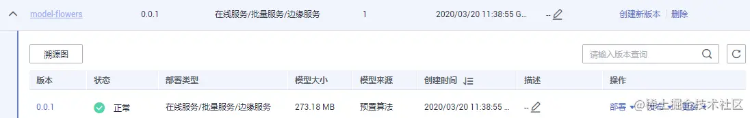 1)在“模型管理 > 模型”页面,单击模型名称左侧的小三角,打开此模型下的所有版本。在对应版本所在行,单击操作列的“部署”,然后在下拉框中选择“在线服务”,进入“部署”页面。