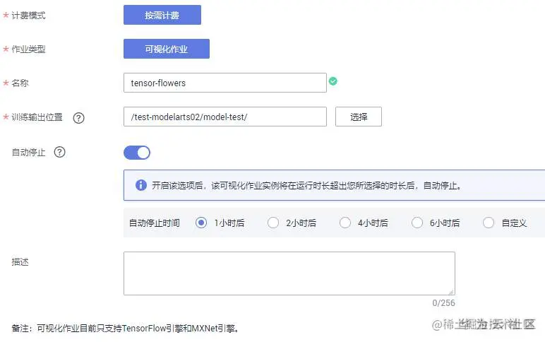 可视化作业的类型默认为“可视化作业”,且不可更改。设置可视化作业的“名称”,以及“训练输出位置”。“训练输出位置”需要设置为训练作业中的“训练输出位置”,上述步骤中“训练输出位置”为“/test-modelarts/model-test/”。“自动停止”启用,并设置为“1小时后”停止,避免产生不必要的费用。