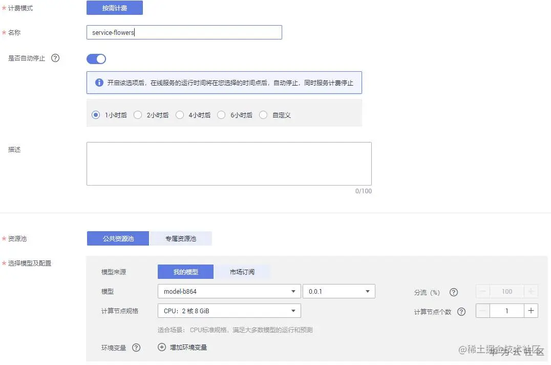 设置在线服务的“名称”,将“是否自动停止”功能启用。在“选择模型及配置”区域中,系统将自动选择步骤4:导入模型中的模型及其版本,在“计算节点规格”右侧下拉框中选择使用的资源,本示例选用“CPU:2核 8GiB”资源部署在线服务。其他参数使用默认值。