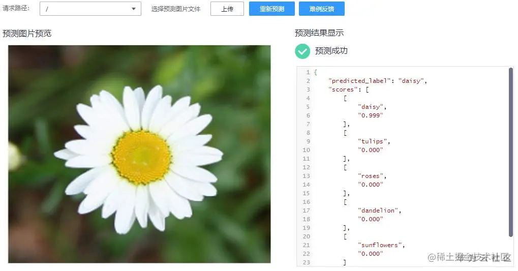 - 预测完成后,预测结果显示区域将展示预测结果,根据预测结果得分,可识别出此图片的花为“daisy”。