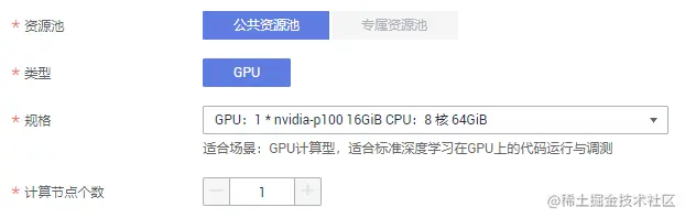 - 在资源设置区域,选择“公共资源池”,同时设置“规格”和“计算节点个数”。