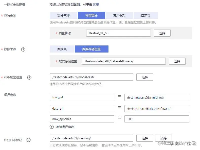 - 在参数配置区域,选择“算法来源”,设置“数据来源”、“训练输出位置”、“运行参数”和“作业日志路径”。