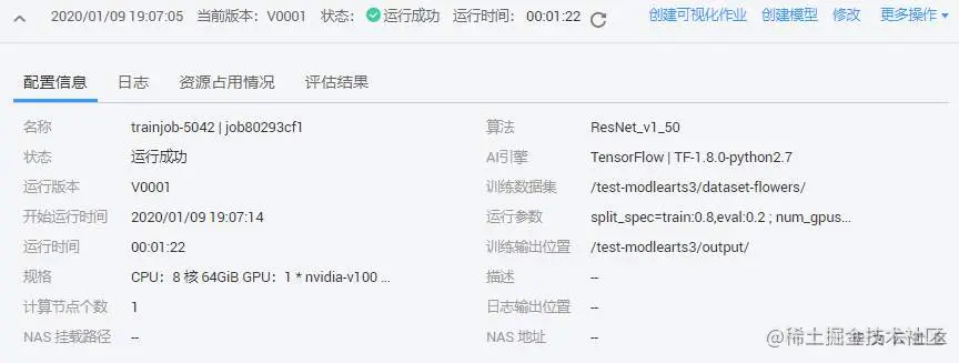 您可以单击训练作业的名称,可进入此作业详情页面,了解训练作业的“配置信息”、“日志”和“资源占用情况”等信息。在“训练输出位置”所在的OBS路径中,即“/test-modelarts/model-test/”路径,可以获取到生成的模型文件。