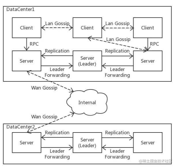 从上图可知,Consul 主要由 Consul Client 和 Consul Server 组成,且 Consul 使用 Gossip 协议来管理成员和广播消息到集群。