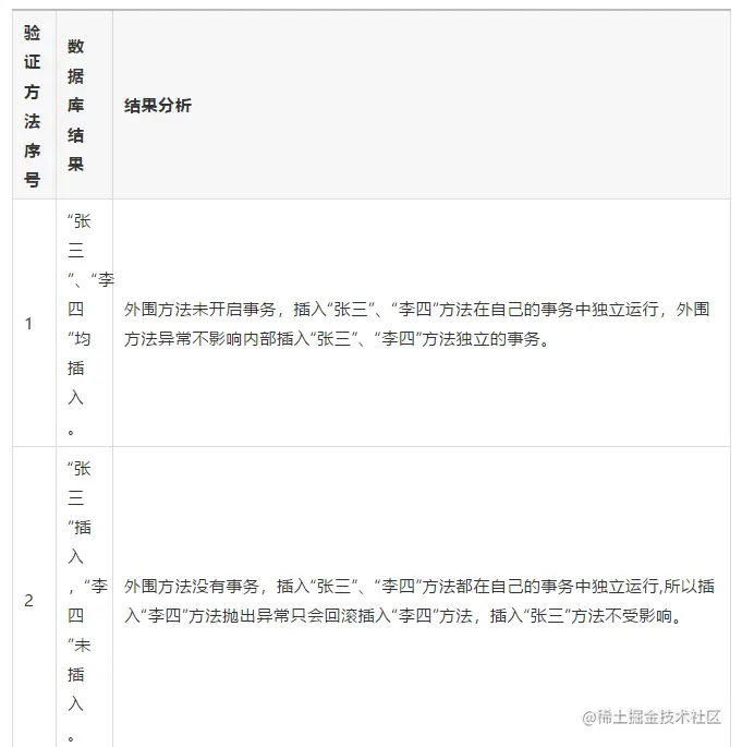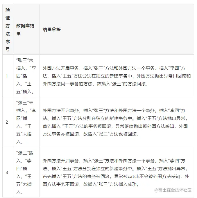 结论:在外围方法开启事务的情况下Propagation.REQUIRES_NEW修饰的内部方法依然会单独开启独立事务,且与外部方法事务也独立,内部方法之间、内部方法和外部方法事务均相互独立,互不干扰。