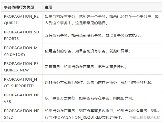 Spring在TransactionDefinition接口中规定了7种类型的事务传播行为。事务传播行为是Spring框架独有的事务增强特性,他不属于的事务实际提供方数据库行为。这是Spring为我们提供的强大的工具箱,使用事务传播行可以为我们的开发工作提供许多便利。但是人们对他的误解也颇多,你一定也听过“service方法事务最好不要嵌套”的传言。要想正确的使用工具首先需要了解工具。本文对七种事务传播行为做详细介绍,内容主要代码示例的方式呈现。