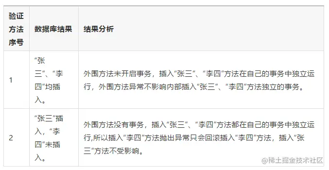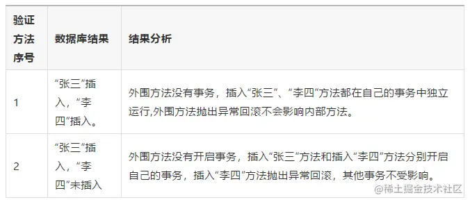 结论:通过这两个方法我们证明了在外围方法未开启事务的情况下Propagation.NESTED和Propagation.REQUIRED作用相同,修饰的内部方法都会新开启自己的事务,且开启的事务相互独立,互不干扰。