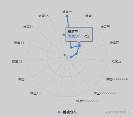 因为维度的总分参差不齐,我想都把维度都转化成百分制的形式(yAxis设置了min和max),这样整体显示美观一些。