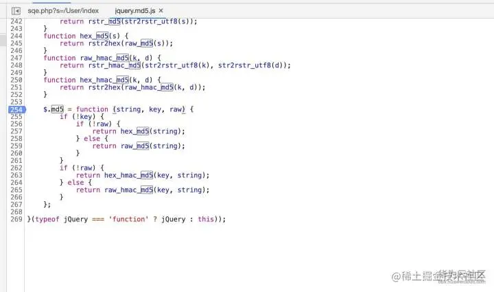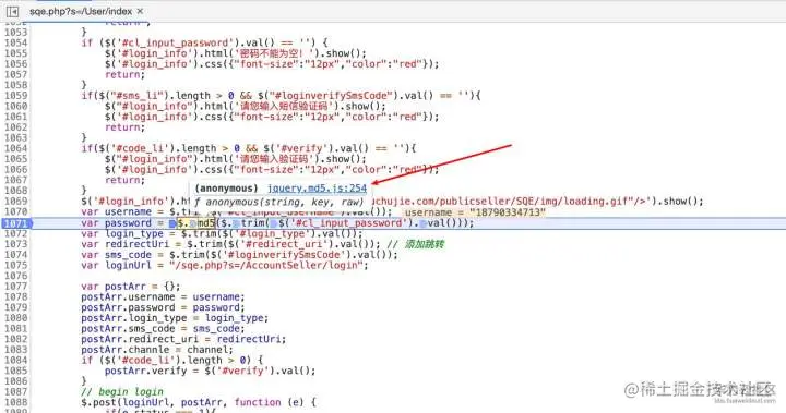 一个一个排查,最终我们找到了加密的地方,md5加密,打上断点进行调试,重新点击登录,停在了我们断点的地方