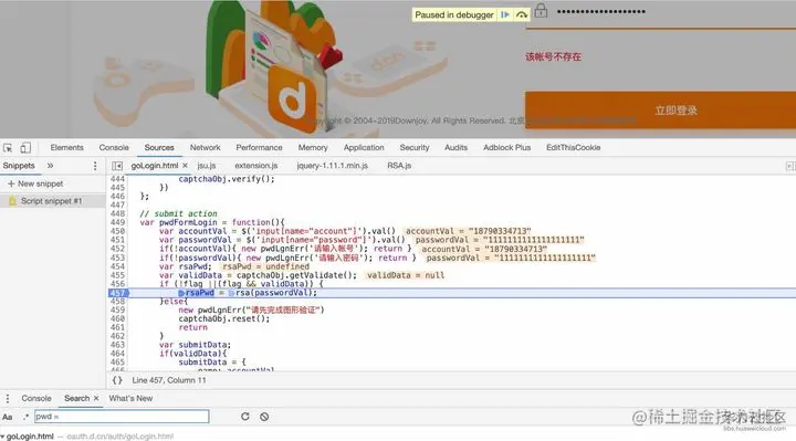 点击登录,会停在我们打断上的地方,可以看到, rsa函数对我们的密码进行了处理