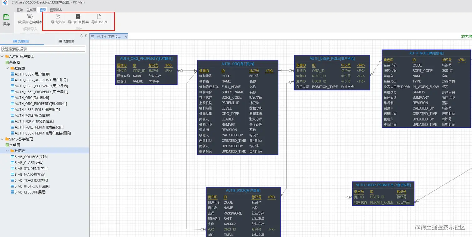PDMan 支持一键导出数据表结构的DDL执行脚本,JSON格式数据,还有数据库表结构文档,其中数据库文档又可以生成 html 、word、markdown 三种格式,文档内容包括各个表的字段属性,数据表间的关系图。
