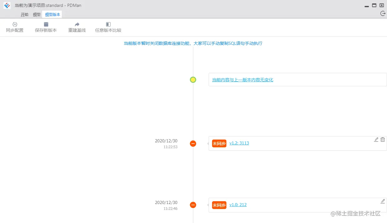 PDMan 可以控制每次修改的版本,对任意版本间的修改进行比对,和Git的版本控制类似。
