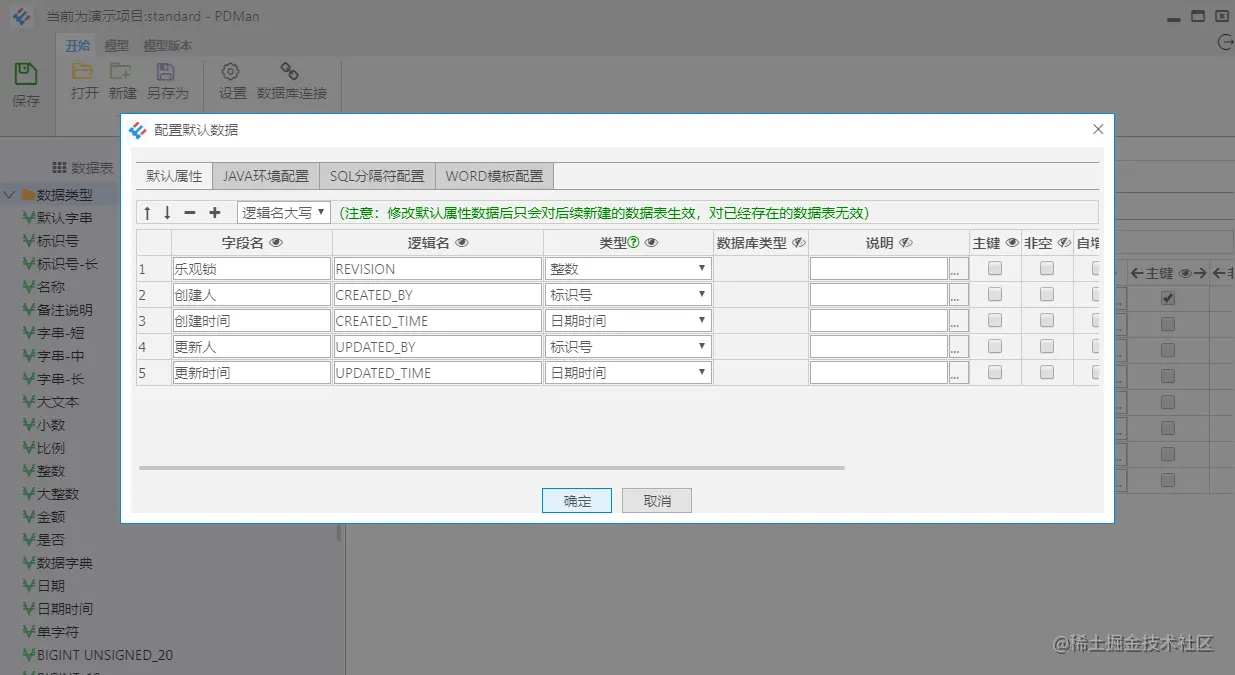 设置表结构的全局通用字段属性,通常在建表的时候,每个表都会有像创建时间 create_time、更新时间update_time、删除标记delete_flag、乐观锁revision这类字段,这样设置完以后在建表时会自动生成。
