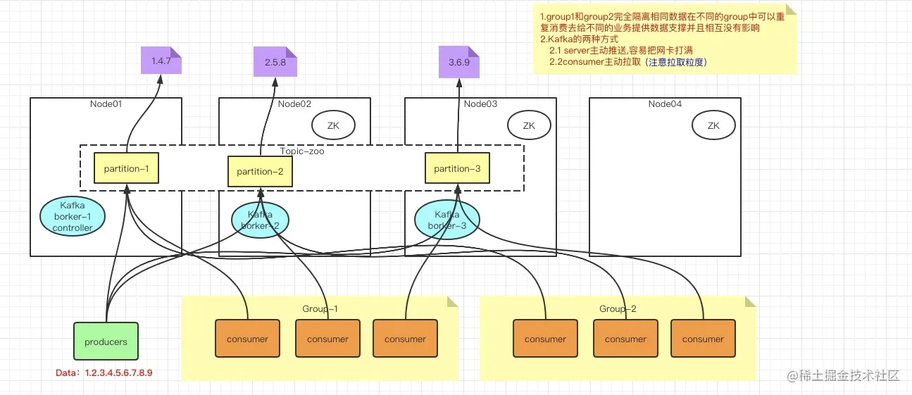 - zk在kafka集群中的作用:在老版本中zk在kafka集群中起到调度和存储的作用,随着请求和数据的爆发,zk就只负责协调调度不在负责存储(因为存储的话网络IO会成为整个集群的瓶颈)。(中间过渡时代有的公司会使用一些DB进行存储如redis,mysql)
