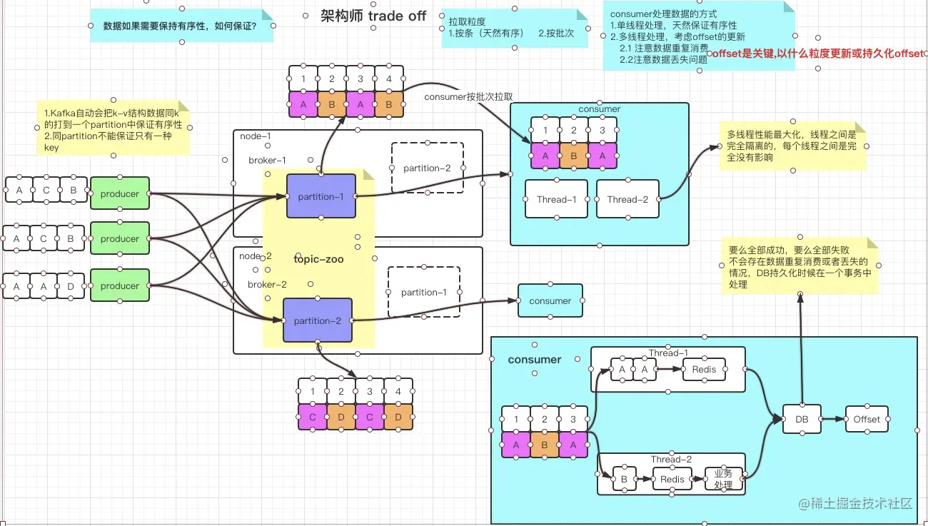 - consumer:对于consumer的思考就是如何安全有序快速的消费数据,一般情况下我们可以串行消费数据或者并发消费数据,和拉取的粒度问题(按条天然有序,按批次)。说到并发就会想到多线程。但是在多线程中保证数据不会丢失或者重复消费就是重中之重。那么这两个问题就是下面我们要聊的offset