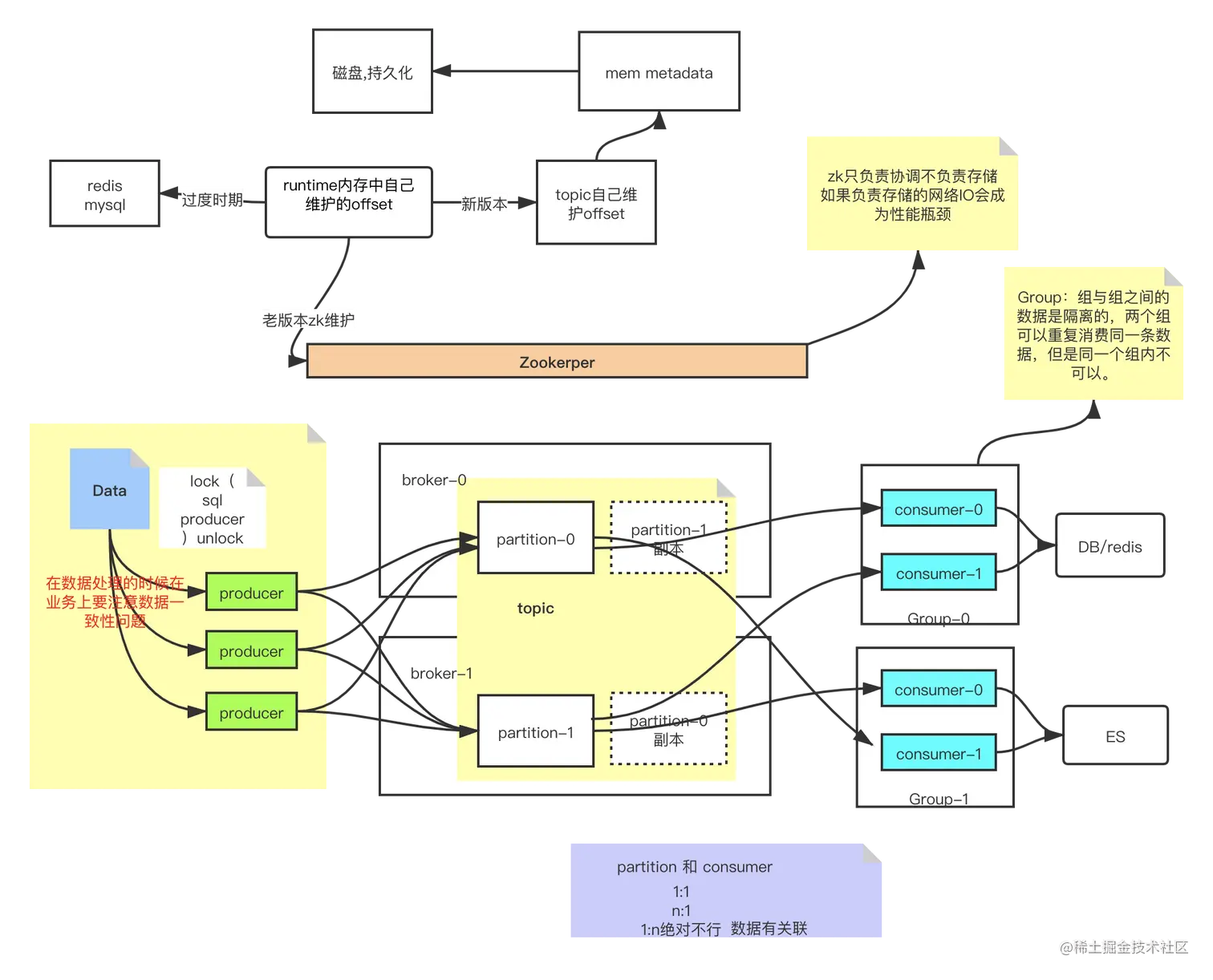 - topic:topic是一个逻辑分区,其实物理上是不存在的,不同的topic数据是分离的,并且现在每个topic自己维护offset信息。topic是可以跨broker,也是可以跨partition的。 topic-> mem metadata->磁盘,持久化