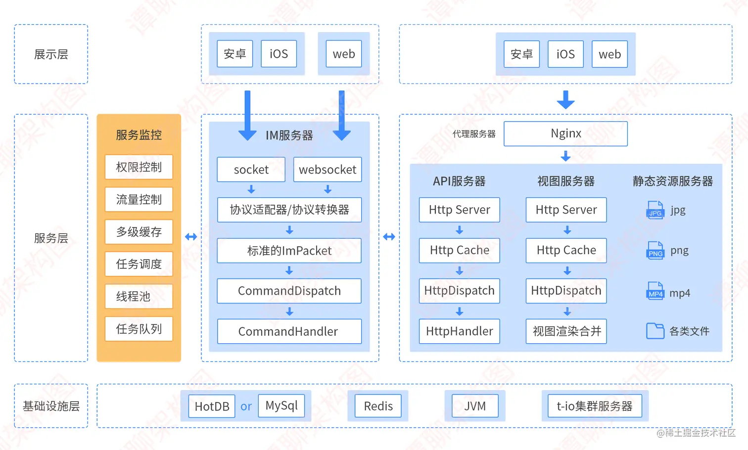 web型的客户端,用websocket会比较自然舒服;非web型的客户端如安卓、IOS,用普通的socket会比较舒服简单。于是服务器就需要同时支持普通socket和websocket,为了减化业务开发,统一消息体结构,本架构特别放置了协议适配器和协议转换器,用于将不同协议的Packet统一成业务需要的Packet。好在t-io内置了协议转换器,也提供了端口数据共享的机制,所以在实现本架构的意图时就变得相对简单。