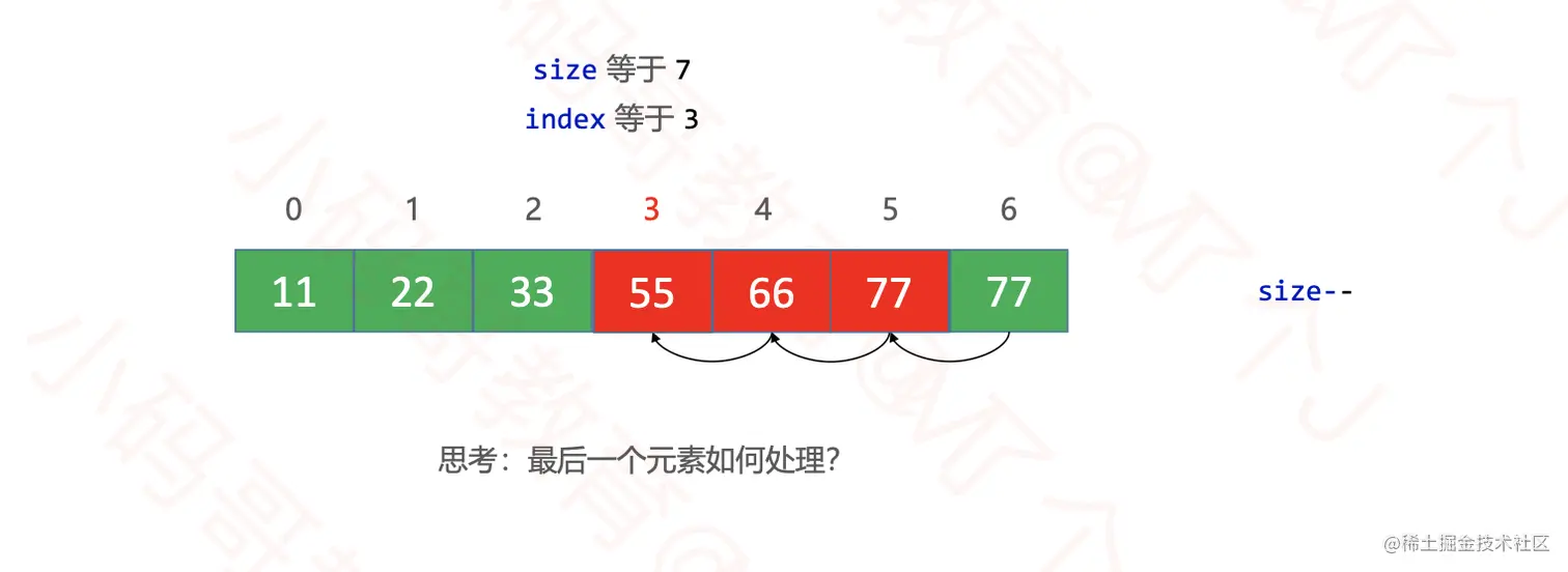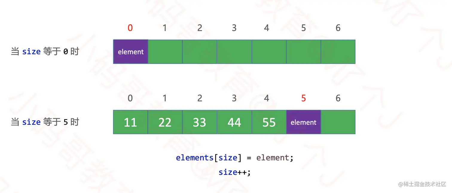 - 这个 新添加的元素的索引 就是 **当前数组的长度,**size就是当前数组的长度,所以将新添加的元素放在size索引的位置,然后size加1