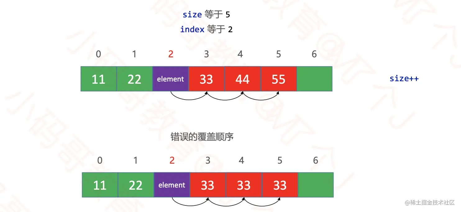arrayList本来有5个元素,在index=2出入一个新的元素。需要把原来index=4的55,移动到index=5,依次向右移动