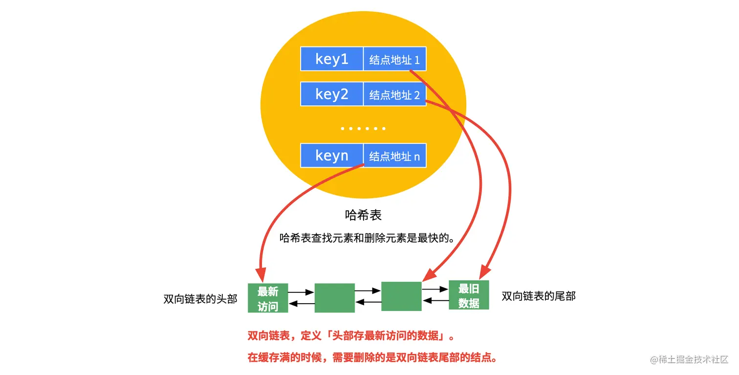 - 在缓存满的时候,删除缓存里最久未使用的数据,然后再放入新元素;