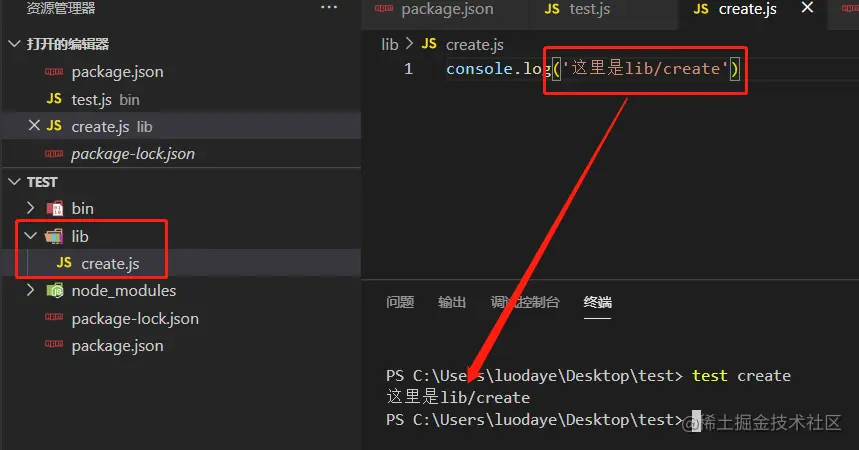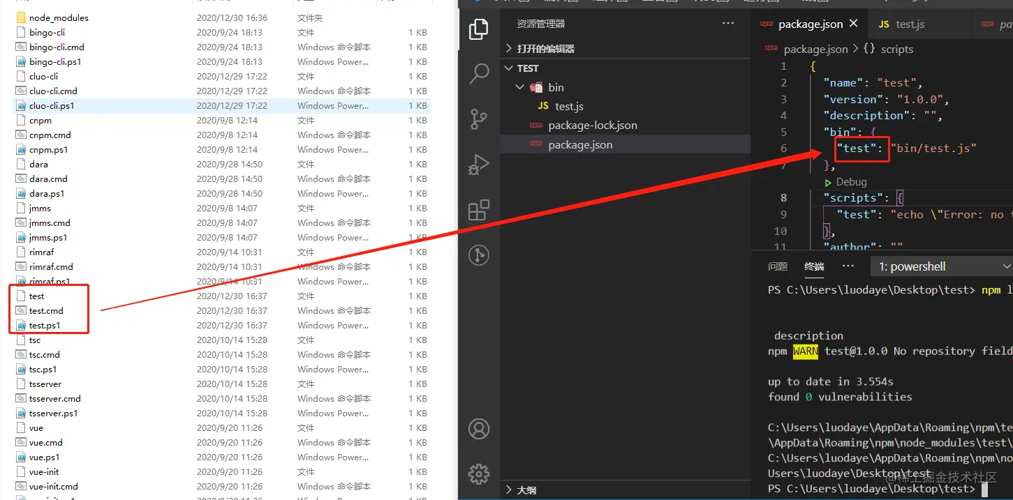 对比上面失败的效果,你会发现这次系统识别了test命令,而且控制台输出了test。到这里上面的疑问应该都解开了:执行npm link,将当前的代码在npm全局目录下留个快捷方式,npm检测到package.json里面存在一个bin字段,它就同时在全局npm包目录下生成了一个可执行文件: