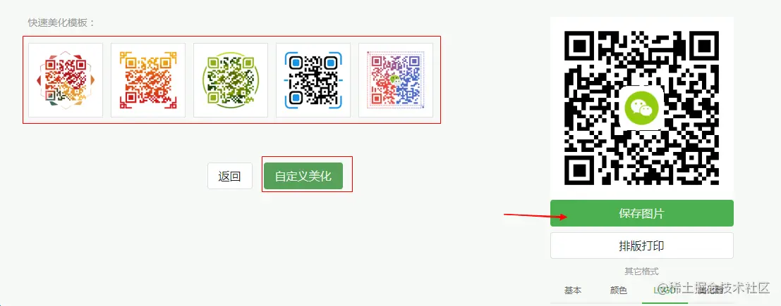 在这里你可以美化你自己的二维码,左上方部分是一个快速美化的模板,如果你不想麻烦,也可以使用它,看起来还是不错的