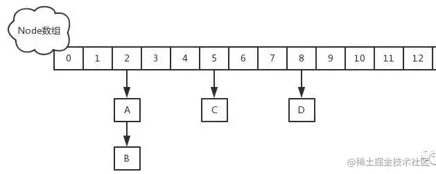 因为 hashCode 相同,不一定就是相等的(equals方法比较),所以两个对象所在数组的下标相同,"碰撞"就此发生。又因为 HashMap 使用链表存储对象,这个 Node 会存储到链表中。