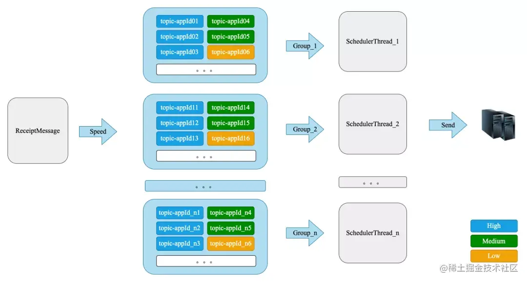个推利用此特性为每个App都创建了不同的topic,为我们后续实时调整优先级和下发速度打下了强有力的基础,详情见细节方案。