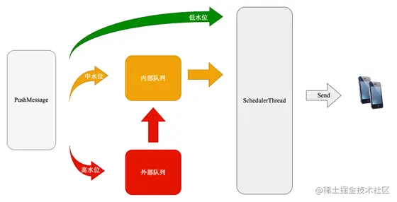 当外部队列内的消息消费完,机器资源运行水位缓慢降低到中水位时,内部队列才开始接收其他渠道的推送消息。这样可以避免消息之间的资源竞争,还可以保持后续处理逻辑的统一性。