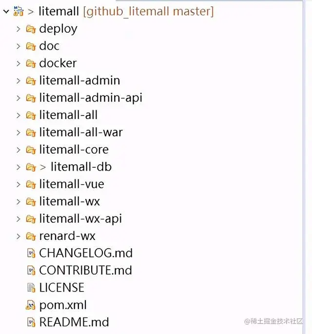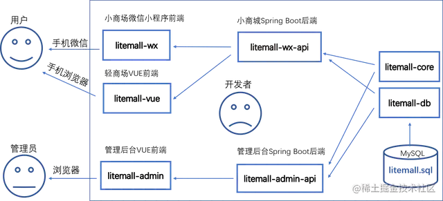 该仓库并不止只有后台代码,还包括Vue管理后台前端、微信小程序商城端 、H5移动端商城。代码结构如下图