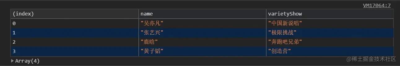 var arr = [ { name: '吴亦凡', varietyShow: '中国新说唱' }, { name: '张艺兴', varietyShow: '极限挑战' }, { name: '鹿晗', varietyShow: '奔跑吧兄弟' }, { name: '黄子韬', varietyShow: '创造营' },]