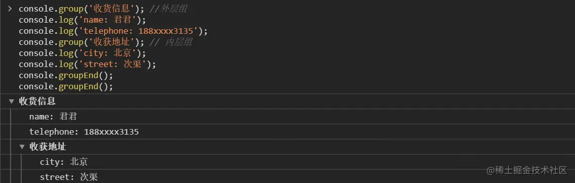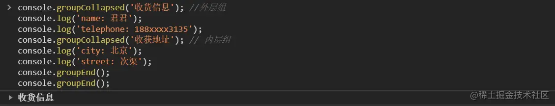 有的时候你想要将你打印的信息更加直观,可以选择分组查看,并且控制台里可以折叠/展开。