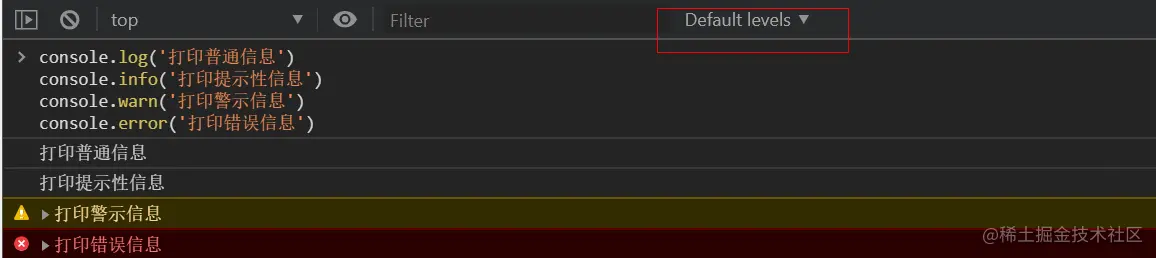 这里注意一下,图里红框框住的Default levels。里面按照严重的级别排序分别为:Verbose(详细),Info(信息),Warnings(警告),Error(错误)。我们可以通过下拉框的选择搭配Filter的功能来对控制台打印的信息进行筛选。