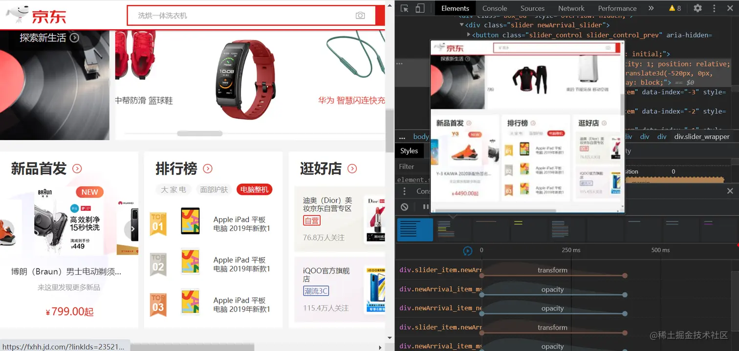 首先我们如何开启呢,可以通过两种方式,一种是通过命令菜单:Show Animations或者通过右上角的三个点打开More tools的工具,选中Animations。这里以京东主站为例,演示下打开后的效果。