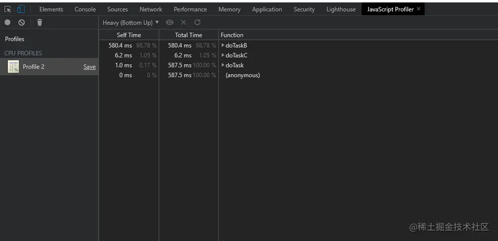 chrome浏览器想要查看性能面板,不会在控制台直接打印,需要点击右上角的三个点,需要点击More tools下的Javascript Profiler。