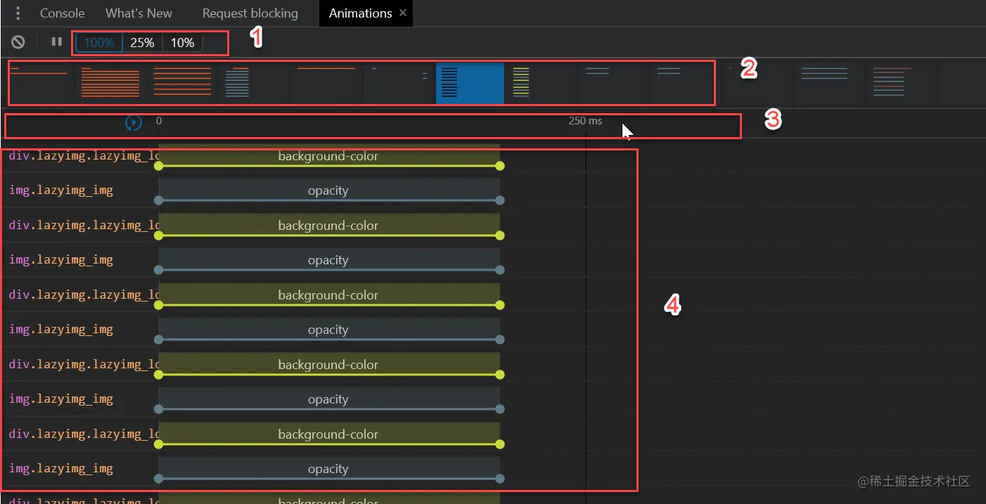当我们在开启动画检查功能后,可以实现检查我们的动画或者修改我们的动画,然后直观的在页面上展示的功能。检查时,可以减慢、重播或查看动画组的源代码。修改时,可以修改动画组的时间,延迟(**100%,25%,10%**三挡),持续时间或关键帧偏移。